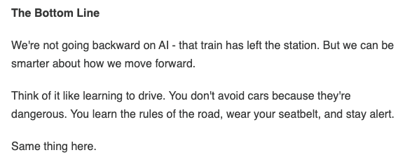 “No vamos a retroceder en IA – ese tren ya salió de la estación. Pero sí podemos ser más inteligentes en cómo avanzamos. Es como aprender a conducir. No evitas los autos porque sean peligrosos. Aprendes las reglas de tránsito, te pones el cinturón y te mantienes alerta.”