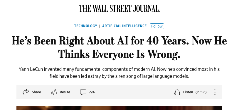 Fuente: Wall Street Journal: Yann LeCun Thinks Everyone is Wrong About AI